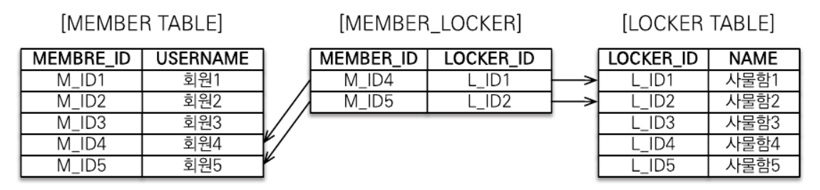 일대다에서 방향만 반대이므로 조인 테이블 모양은 앞의 그림과 같다.