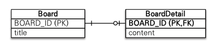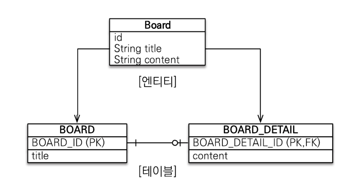 하나의 엔티티에 여러 테이블 매핑하기 @Entity @Table(name = "BOARD") @SecondaryTable(name = "BOARD_DETAIL", pkJoinColumns = @PrimaryKeyJoinColumn(name = "BOARD_DETAIL_ID")) public class Board { @Id @GeneratedValue @Column(name = "BOARD_ID") private Long id; private String title; @Column(table = "BOARD_DETAIL") private String content; ... }@Table 을 사용해서 Board 테이블과 매핑했다.