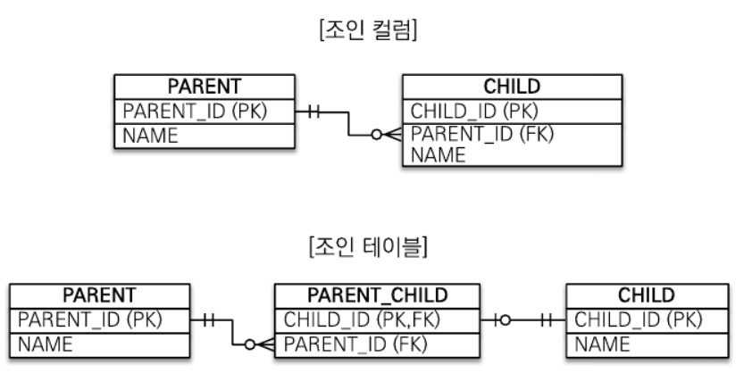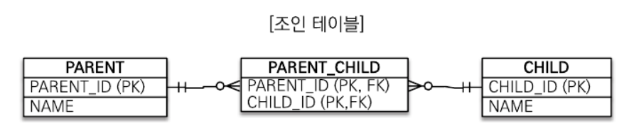 조인 테이블 다대다 //부모 @Entity public class Parent { @Id @GeneratedValue @Column(name = "PARENT_ID") private Long id; private String name; @ManyToMany @JoinTable(name = "PARENT_CHILD", joincolumns = @JoinColumn(name = "PARENT_ID"), inverseJoinColumns = @JoinColumn(name = "CHILD_ID") ) private List<Child> children = new ArrayList<>(); ... } //자식 @Entity public class Child { @Id @GeneratedValue @Column(name = "CHILD_ID") private Long id; private String name; ... }참고)