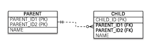 여기서는 PARENT_ID, CHILD_ID가 복합 기본 키이므로 유니크 제약조건이 걸려 있다.