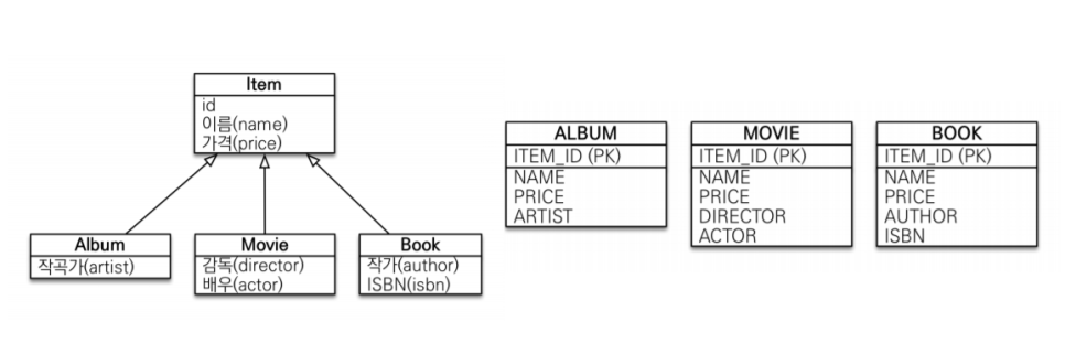 @Entity @Inheritance(strategy = InheriganceType.TABLE_PER_CLASS) // 구현 클래스마다 테이블 전략 사용 public abstract class Item { @Id @GeneratedValue @Column(name = "ITEM_ID") private Long id; private String name; private int price; ... } @Entity public class Album extends Item { ... } @Entity public class Movie extends Item { ... } @Entity public class Book extends Item { ... }InheritanceType.TABLE_PER_CLASS 로 지정하여 구현 클래스마다 테이블 전략을 사용한다.