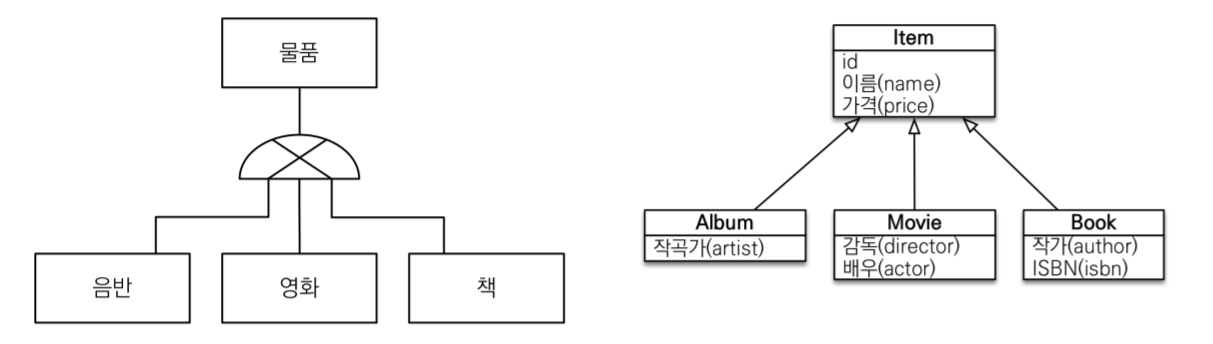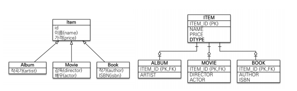 @Entity @Inheritance(strategy = InheritanceType.JOINED) // 조인 전략 사용 @DiscriminatorColumn(name = "DTYPE") // 구분 컬럼 지정 (기본값: DTYPE) public abstract class Item { @Id @GeneratedValue @Column(name = "ITEM_NAME") private Long id; private String name; private int price; ... } @Entity @DiscriminatorValue("A") // 구분 컬럼의 값: A public class Album extends Item { private String artist; ... } @Entity @DiscriminatorValue("M") // 구분 컬럼의 값: M public class Movie extends Item { private String director; private String actor; ... } @Entity @DiscriminatorValue("B") // 구분 컬럼의 값: B @PrimaryKeyJoinColumn(name = "BOOK_ID") public class Movie extends Item { private String author; private String isbn; ... }@Inheritance(strategy = ...)