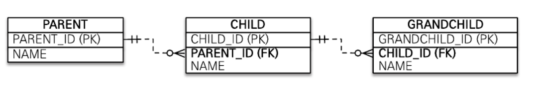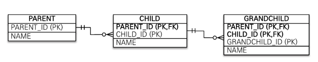 //부모 @Entity public class Parent { @Id @GeneratedValue @Column(name = "PARENT_ID") private Long id; private String name; ... } //자식 @Entity public class Child { @Id @GeneratedValue @Column(name = "CHILD_ID") private Long id; private String name; @ManyToOne @JoinColumn(name = "PARENT_ID") private Parent parent; ... } //손자 @Entity public class GrandChild { @Id @GeneratedValue @Column(name = "GRANDCHILD_ID") private Long id; private String name; @ManyToOne @JoinColumn(name = "CHILD_ID") private Child child; ... }3.5. 일대일 식별 관계