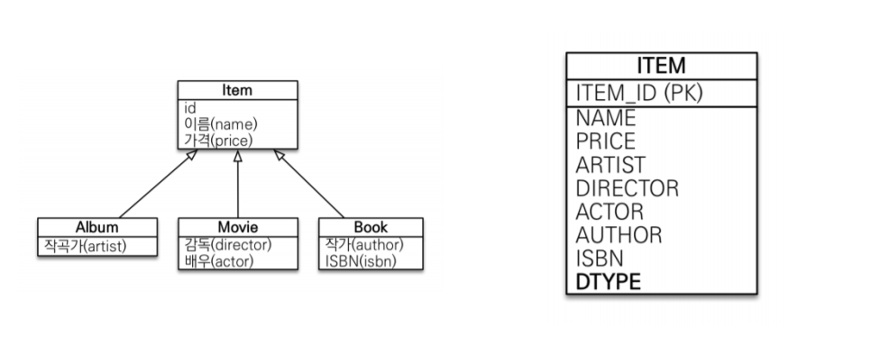 @Entity @Inheritance(strategy = InheriganceType.SINGLE_TABLE) // 단일 테이블 전략 사용 @DiscriminatorColumn(name = "DTYPE") public abstract class Item { @Id @GeneratedValue @Column(name = "ITEM_ID") private Long id; private String name; private int price; ... } @Entity @DiscriminatorValue("A") public class Album extends Item { ... } @Entity @DiscriminatorValue("M") public class Movie extends Item { ... } @Entity @DiscriminatorValue("B") public class Book extends Item { ... }InheritanceType.SINGLE_TABLE 로 지정하여 단일 테이블 전략을 사용한다.