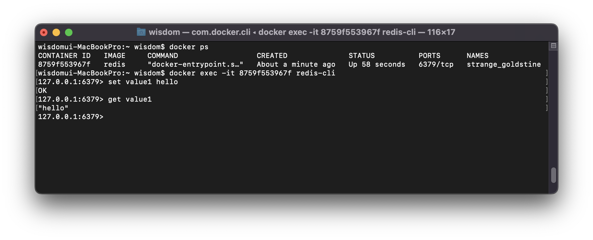 이제 docker exec를 이용해서 도커 환경에서 레디스를 사용해보자.
