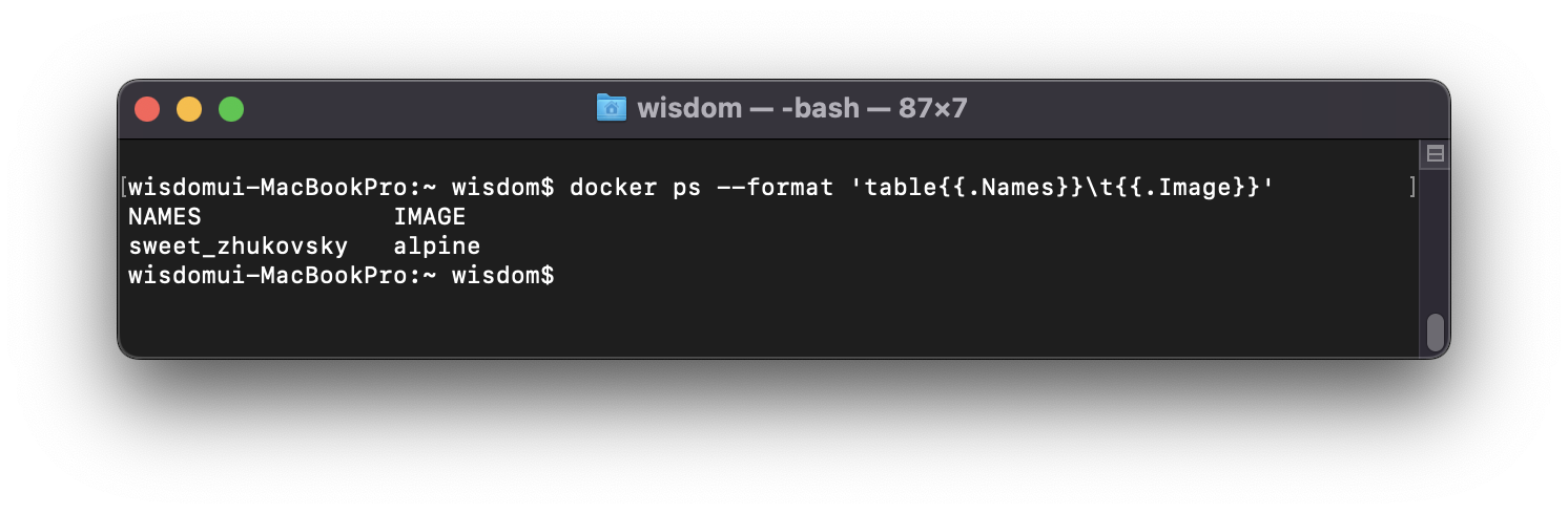 $ docker ps --format 'table{{.항목명}}구분자{{.항목명}} ... ' # 항목명의 첫 글자는 대문자, 나머지는 소문자ex) $ docker ps --format 'table{{.Names}}\t{{.Image}}'