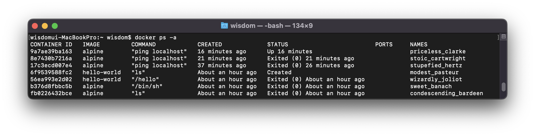 실행 중인 것 외의 컨테이너도 모두 확인할 수 있는 명령어는 다음과 같다.