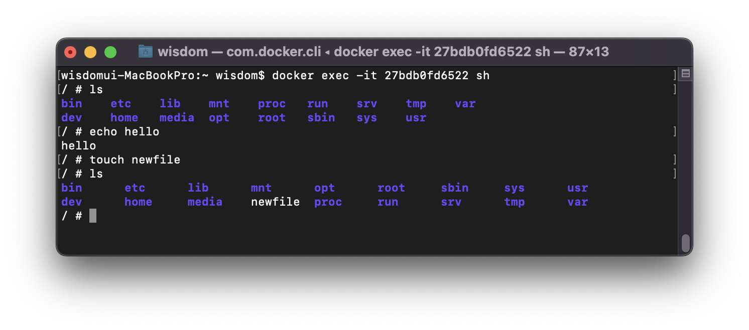 이러한 문제를 해결하기 위해, 컨테이너 안의 쉘 환경으로 접속할 수 있다.$ docker exec -it <컨테이너 아이디> shsh 외에도 bash, zsh, powershell 등을 사용할 수 있지만, 이미지의 환경(OS)에 따라 사용 불가능한 것도 존재하므로 일반적인 sh을 사용하자.
