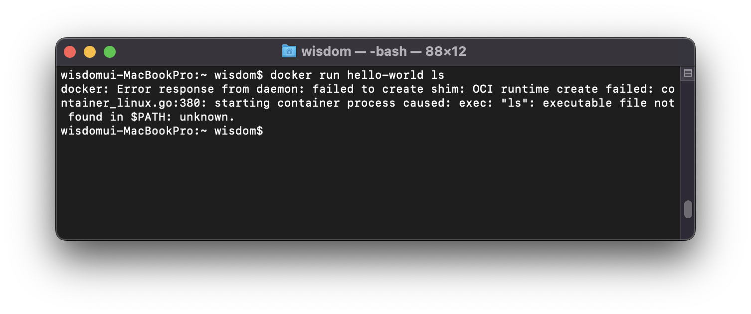 hello-world 이미지에는 ls 라는 명령어를 실행할 수 있는 파일이 존재하지 않아 위와 같은 오류가 나는 것을 확인할 수 있다.