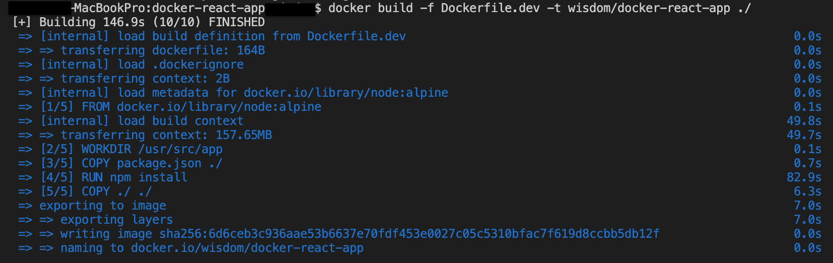$ docker build -f Dockerfile.dev -t [이미지 이름] ./❗️ 도커 파일의 이름이 Dockerfile일 경우에는 파일 이름을 명시하지 않아도 되지만, Dockerfile.dev 라는 이름으로 만들었기 때문에 -f 옵션을 통해 파일 이름을 지정해주었다.