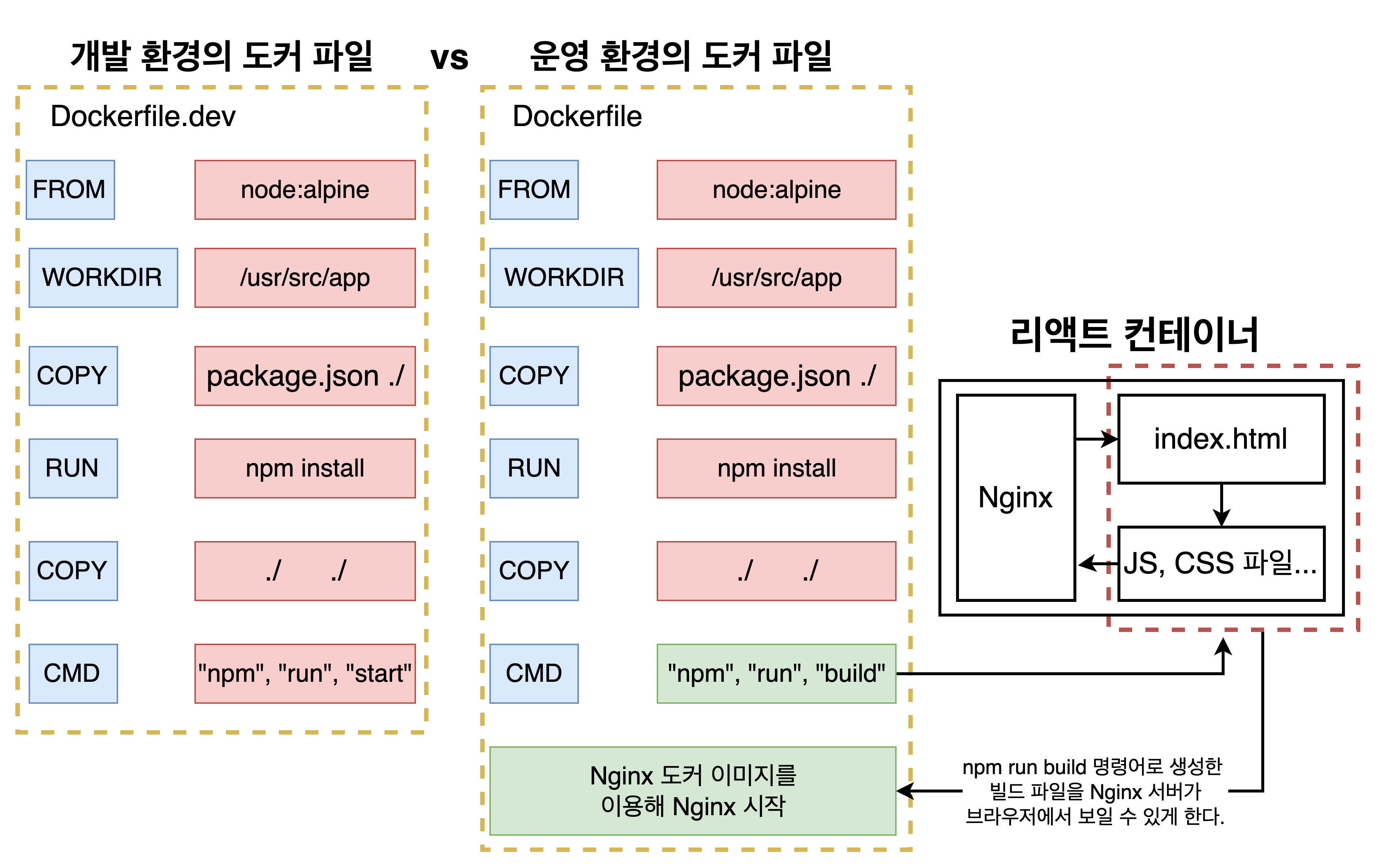 도커 파일의 구조는 다음과 같은 차이가 있다.