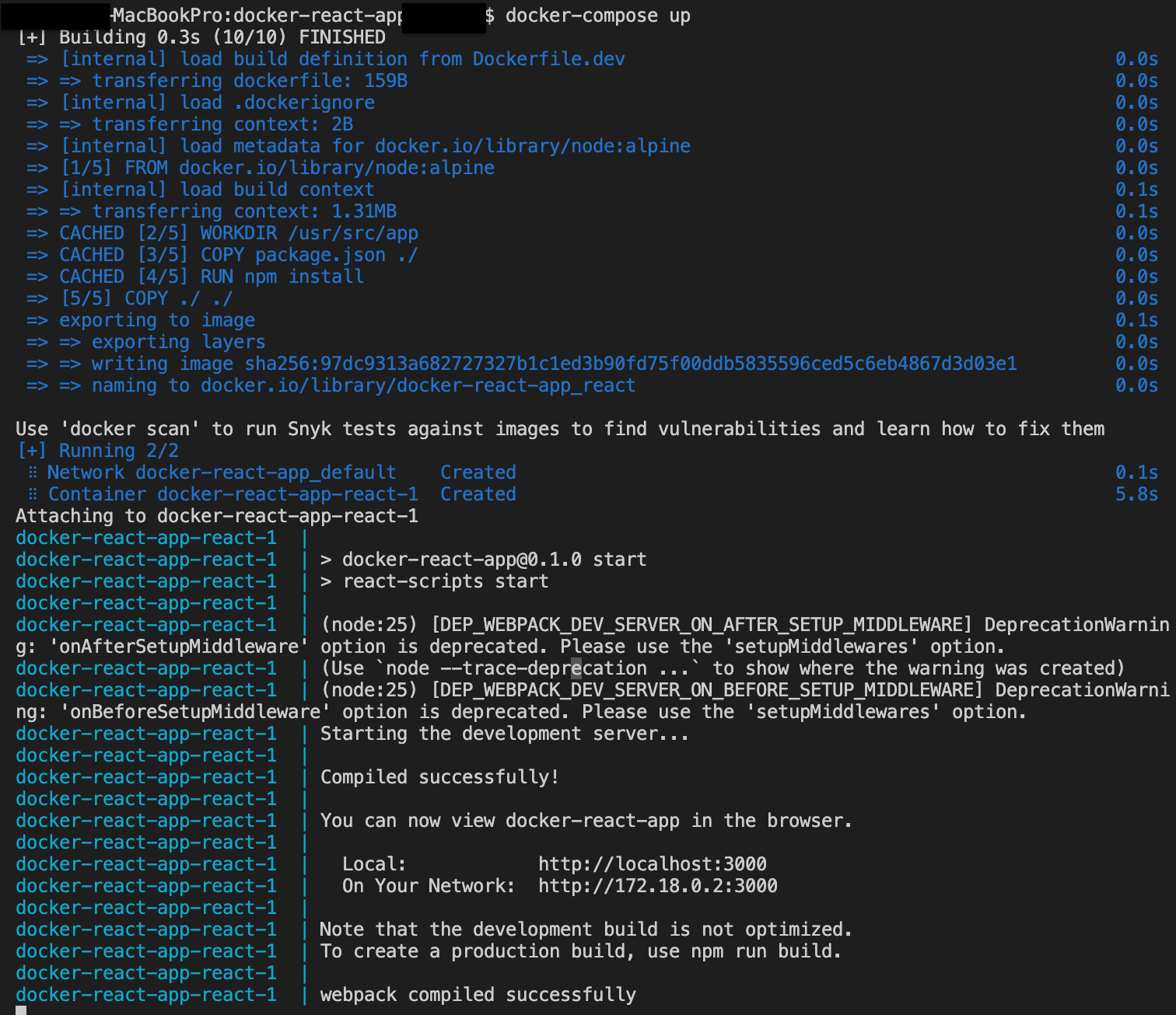 $ docker-compose up --build실행하면 리액트 앱과 테스트가 모두 실행되는 것을 확인할 수 있다.