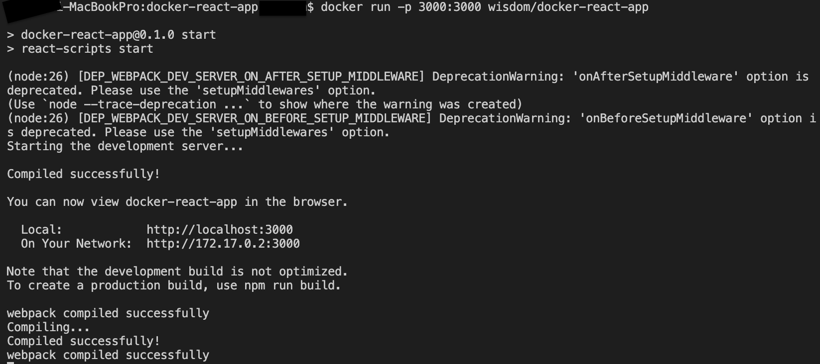 또한, COPY ./ ./ 를 통해 파일을 복사할 때 node_modules가 복사된다. 이미 npm install로 생성하였는데 불필요하게 한 번 더 복사가 되므로 로컬에 있는 node_modules는 지우도록 하자.2️⃣ 도커 이미지로 리액트 앱 실행