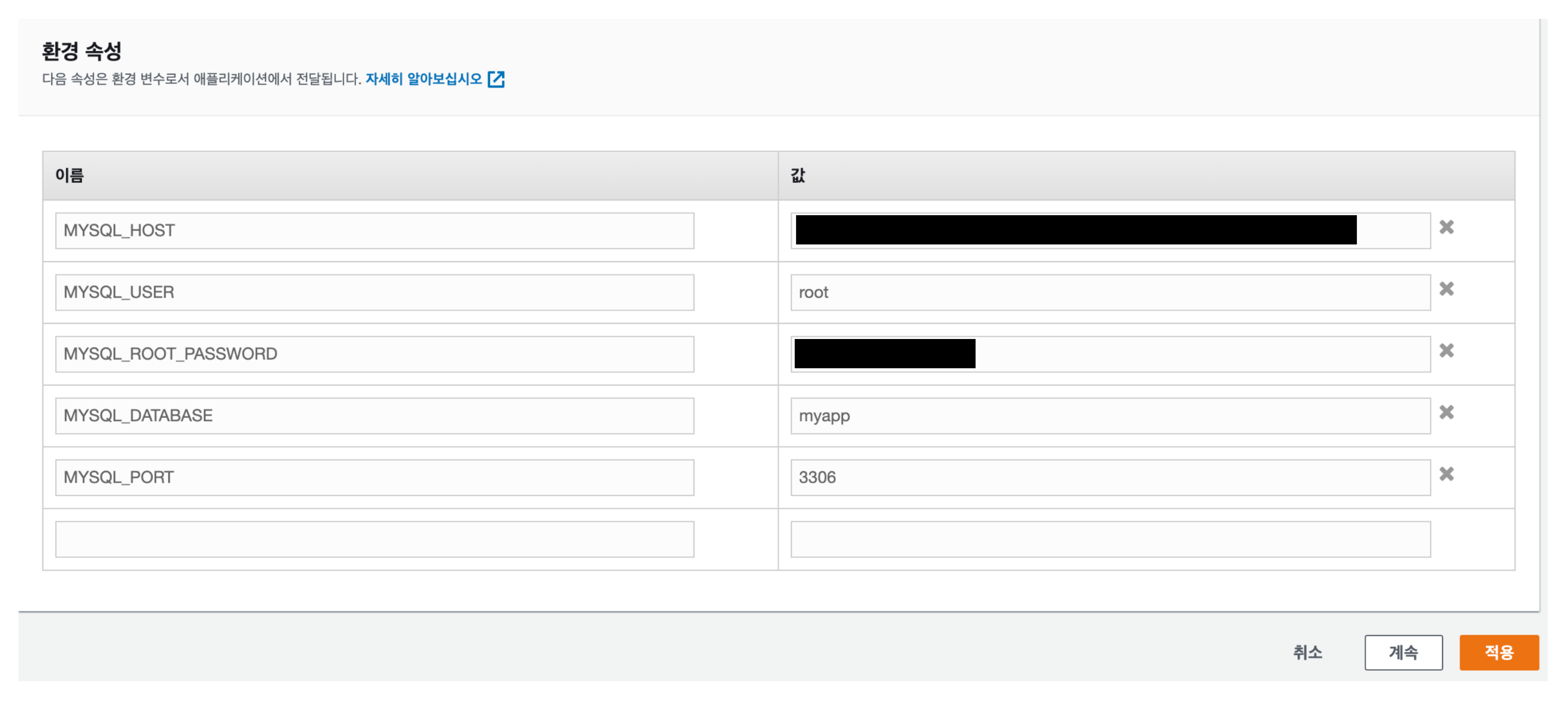 여기에 환경 속성을 추가하여 환경 변수를 설정한다.MYSQL_HOST는 뒷부분에 나오는 RDS의 엔드포인트로 작성한다.
