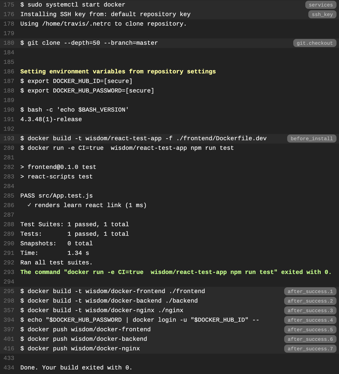 language: generic sudo: required services: - docker before_intall: - docker build -t <docker hub id>/react-test-app -f ./frontend/Dockerfile.dev ./frontend script: - docker run -e CI=true <docker hub id>/react-test-app npm run test after_success: - docker build -t <docker hub id>/docker-frontend ./frontend - docker build -t <docker hub id>/docker-backend ./backend - docker build -t <docker hub id>/docker-nginx ./nginx - echo "$DOCKER_HUB_PASSWORD" | docker login -u "$DOCKER_HUB_ID" --password-stdin - docker push <docker hub id>/docker-frontend - docker push <docker hub id>/docker-backend - docker push <docker hub id>/docker-nginxecho "$DOCKER_HUB_PASSWORD" | docker login -u "$DOCKER_HUB_ID" --password-stdin:
