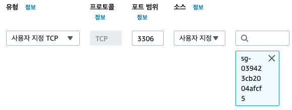 포트 번호를 3306번으로 하고, 소스는 방금 생성한 보안 그룹으로 설정한다.