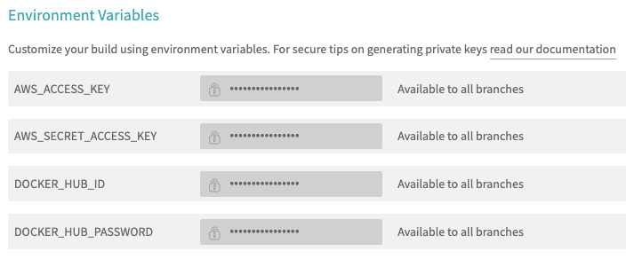 계정 생성 후 발급되는 액세스 키 ID와 비밀 액세스 키를 Travis CI의 환경 변수로 저장한다.